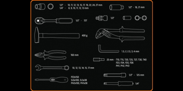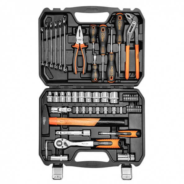 Набор инструмента NEO состоит из 56 предметов, изготовленных из высококачественной хромованадиевой стали и стали S2. В состав набора входят молоток 300 г, пассатижи и трубные клещи, отвертки (шлицевые и крестовые). Дополнительно - трещотка, удлинитель и шарнир 1/2". Кроме того, в наборе имеются торцевые головки 1/2" (размером от 10 до 27 мм), свечные головки 16 и 21 мм, а также комплект комбинированных ключей 10 - 17 мм, который значительно расширяет возможности данного набора. Отличным дополнением является комплект отверточных наконечников (крестовые, шестигранные и Torx) с переходником 1/4", торцевыми головками от 8 до 14 мм 1/4" и отверточным воротком 1/4", а также 5 шестигранных ключей 1.5 - 4 мм. Все упаковано в удобный кейс. Качество и надежность инструмента подтверждены 25-летней гарантией и международным сертификатом TÜV. Бренд NEO оправдывает ожидания профессионалов.