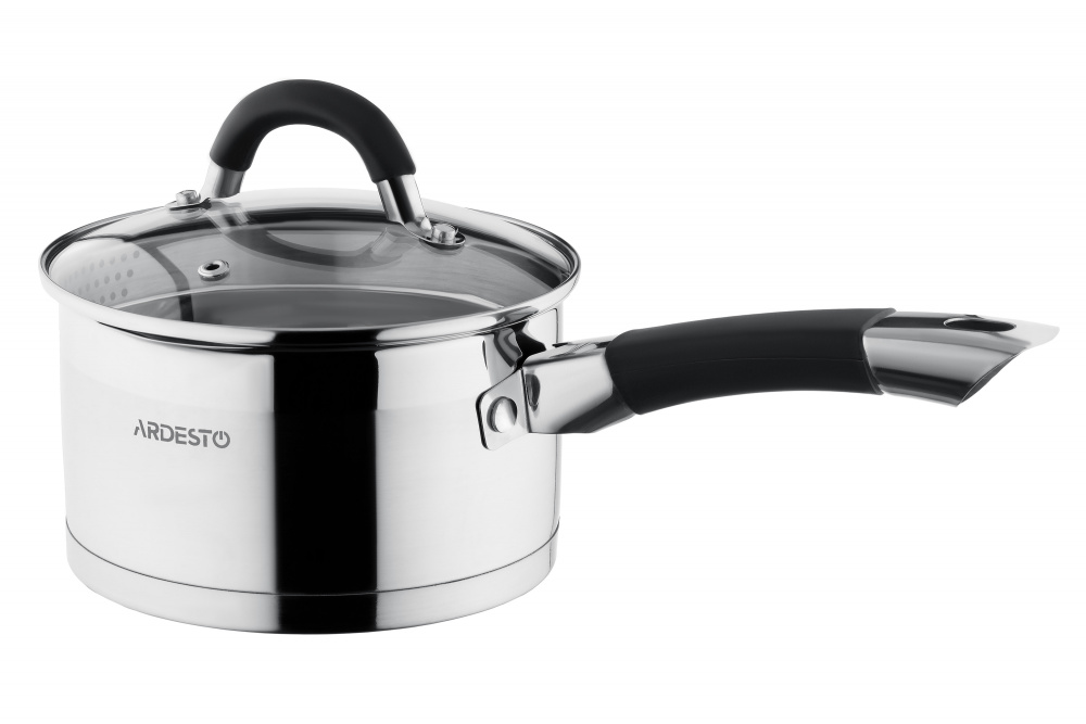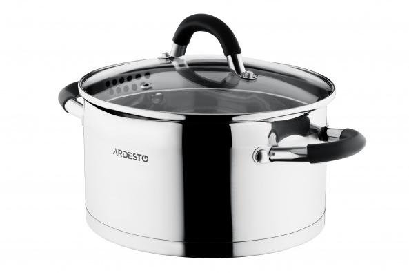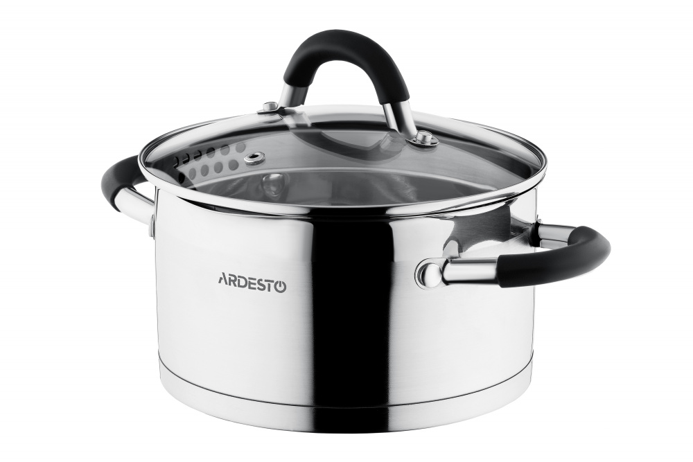 Описание товара Набор посуды Ardesto Gemini Monza со сливом, 8 пред., ручки с серым силиконом, нержавеющая сталь