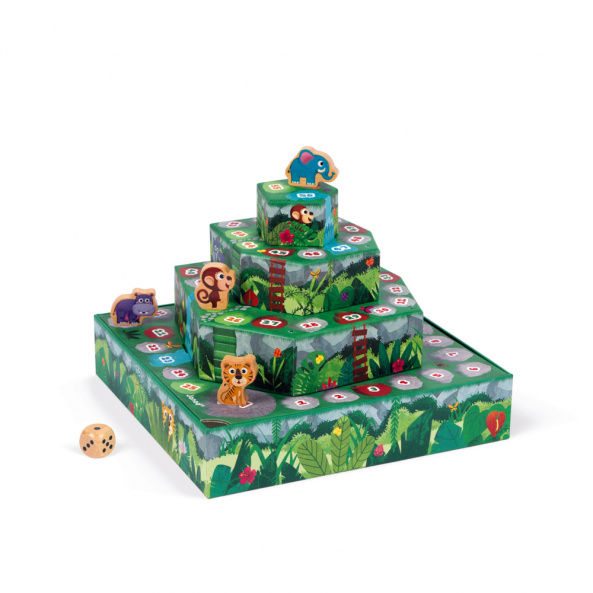 Необычная игра «Джунгли» от французского производителя Janod. Особенность ее в объемном игровом поле, которое состоит из нескольких ярусов. Выбери своего героя - животное, бросайте кости и начинайте подъем по лестнице! Но путь вверх тернистый и вас могут постигнуть трудности в виде водопадов. Цель игры - подняться на вершину первым. Игра рассчитана на 2-4 игроков. Фигурки животных изготовленные из натурального дерева. «Пирамида» - из плотного картона. Рекомендуемый возраст: 5+