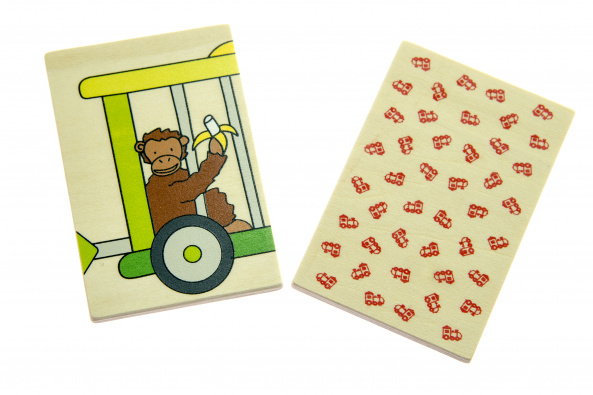 Карткова гра мемо на увагу та запам’ятовування «Кольоровий потяг» складається із 32 легких і приємних на дотик карток. На кожній картці зображена частина потягу того, або іншого кольору. Гра розрахована на декілька гравців, які по черзі відкривають картки і запам’ятовують іх розташування. Виграє той, хто якнайшвидше складе весь потяг свого кольору. Дерев’яні картки вкриті яскравими і нетоксичними фарбами на водній основі. Німецький виробник іграшок goki використовує лише натуральну деревину і безпечні матеріали.