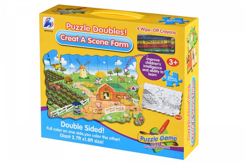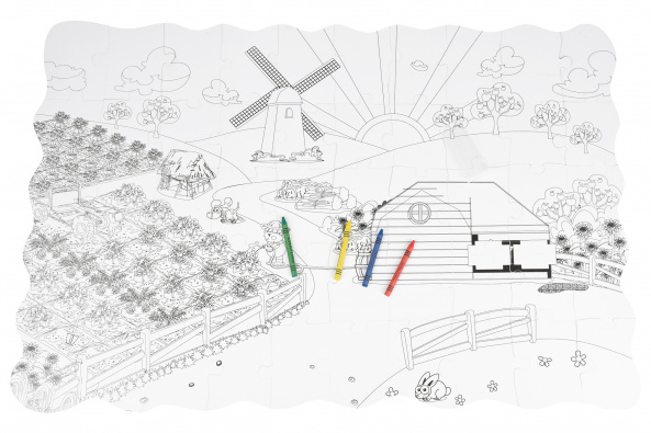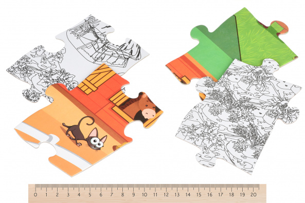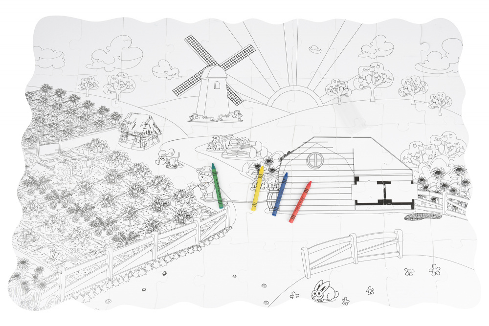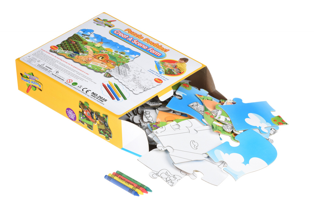 Пазл 2в1: водночас картинка, яка складається з фрагментів і розмальовка. В наборі «Ферма» пазл, який складається з 50 фрагментів, а також набір кольорових 4 воскових олівців. Фрагменти пазла виготовлені з цупкого картону, вони не гнуться, а на дотик гладенькі. З одного боку зображення на деталях кольорове, на зворотному – чорно-біле. Перед дитиною завдання: зібрати пазл і, перевернувши його на зворотну сторону, розфарбувати. Зібрана картинка розміром 82х54 см. Збираючи пазл, діти розвиватимуть дрібну моторику, координацію і спритність рухів, а шукаючи необхідне місце для вкладиша, пам'ять і логічне мислення. Рекомендований вік: 3+.
