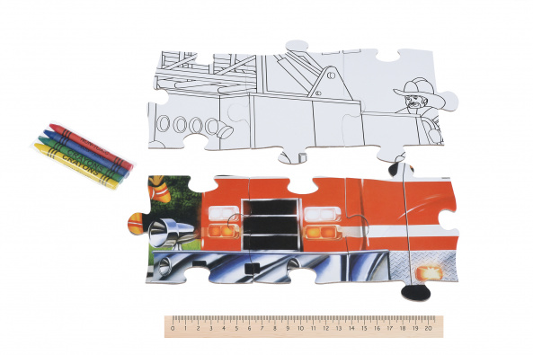 «Пожарная машина» - необычный пазл для детей от 3 лет. Это одновременно развивающая игрушка и набор для творчества. Пазл состоит из 50 фрагментов. На лицевой стороне деталей - яркие изображения, нанесенные качественными красками. На обороте - то же изображение, только черно-белое. Перед ребенком задача - собрать пазл. А перевернув собранную картинку на «черно-белую» сторону, можно ее разрисовать. Для этого в наборе 4 цветных восковых карандаша. С помощью такой игры дети будут развивать навыки мелкой моторики, улучшать память и внимательность.