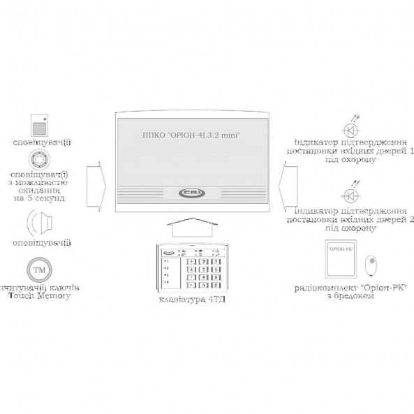 Управление Орион-4И.3.2 mini осуществляется с помощью ключей Touch Memory и, при необходимости, с клавиатуры, причем реализована поддержка до 16 ключей (кодов доступа) и 8 групп ШС.