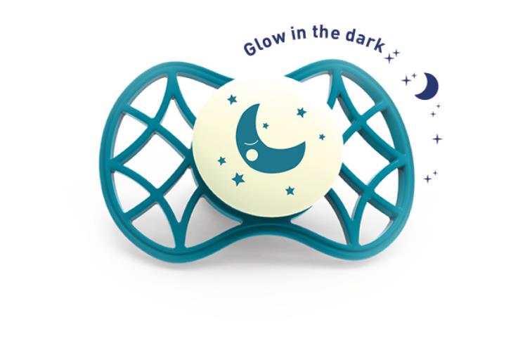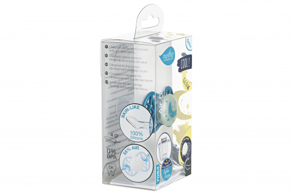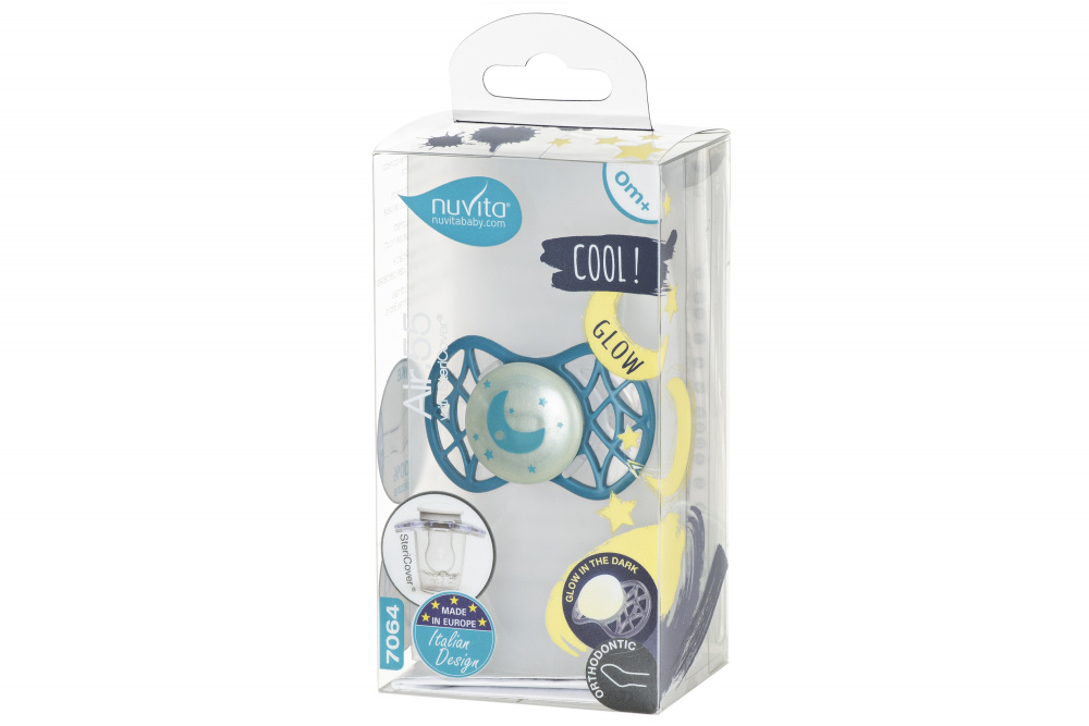 Ортодонтическая пустышка Air55 Cool, которая светится в темноте. Пластинка соски на 55% состоит из воздуха обеспечивая почти полную аэрацию области вокруг рта, избегая скопления слюны, которая может раздражать кожу. Защитный колпачок для соски для поддержания чистоты соски и стерилизации в микроволновой печи простым добавлением воды.