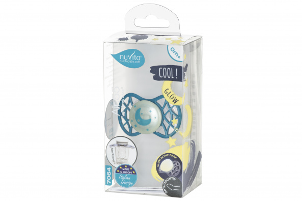 Описание товара Пустышка ортодонтическая Nuvita NV7064 Air55 Cool 0m+"месяц" светящаяся в темноте бирюзовая