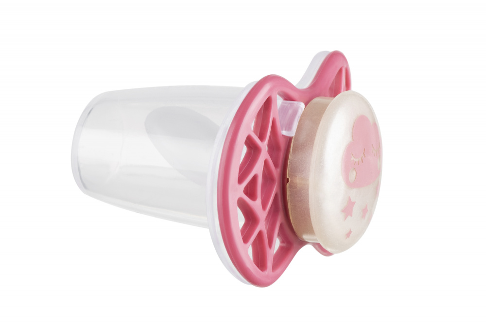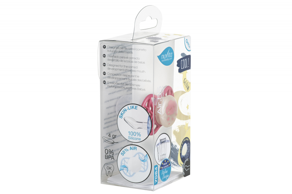 Ортодонтическая пустышка Air55 Cool, которая светиться в темноте. Пластинка соски на 55% состоит из воздуха обеспечивая почти полную аэрацию области вокруг рта, избегая скопления слюны, которая может раздражать кожу. Защитный колпачок для соски для поддержания чистоты соски и стерилизации в микроволновой печи простым добавлением воды.