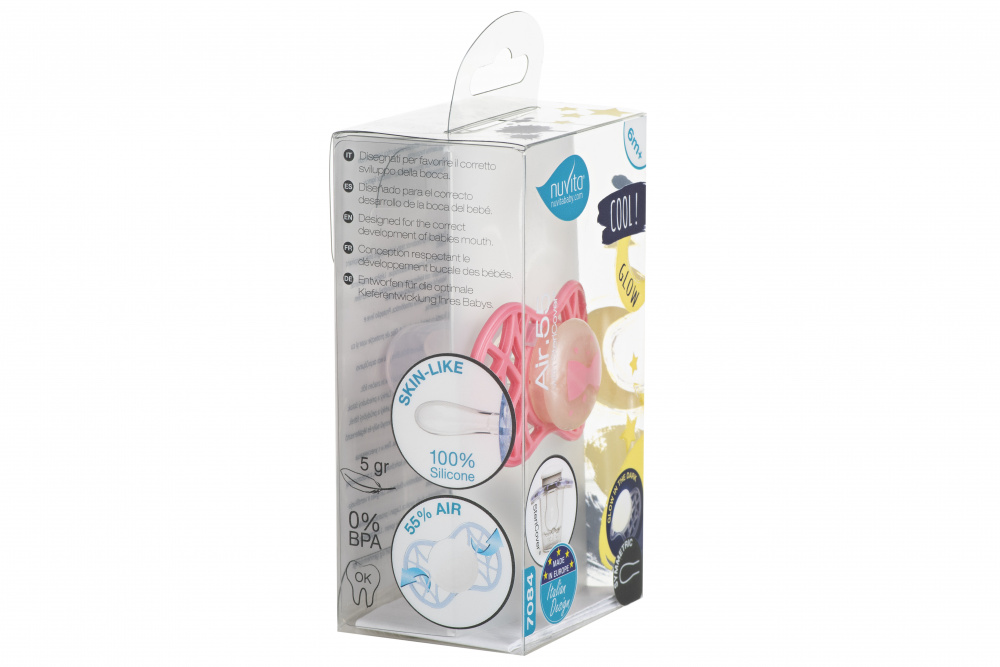 Симметрическая пустышка Air55 Cool, которая светиться в темноте. Пластинка соски на 55% состоит из воздуха обеспечивая почти полную аэрацию области вокруг рта, избегая скопления слюны, которая может раздражать кожу. Защитный колпачок для соски для поддержания чистоты соски и стерилизации в микроволновой печи простым добавлением воды.