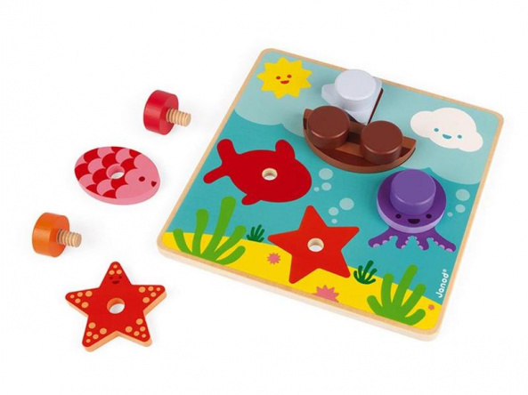 Деревянная игра для детей от 18 до 36 месяцев Простая в использовании благодаря своим большим деревянным винтам. Игра состоит из квадратной деревянной основы и 11 дополнительных элементов, развивает ловкость ребенка и знакомит ее с такими морскими животными, как рыбы, осьминог, морские звезды.