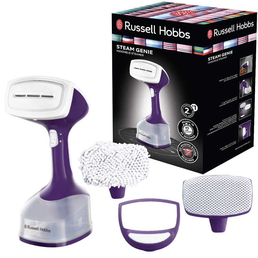 Steam Genie Steam Brush от Russell Hobbs отлично подходит для освежения одежды, портьер и диванных подушек, выпрямления их там, где это необходимо. Устройство не требует длительного времени разогрева и готово к использованию уже через 45 секунд. Чтобы освежить одежду и домашний текстиль за короткое время и избавить их от складок, паровая щетка Steam Genie использует постоянный пар 25 г / мин. Паровую щетку можно использовать с наполнением резервуара для воды на 260 мл в течение одиннадцати минут.