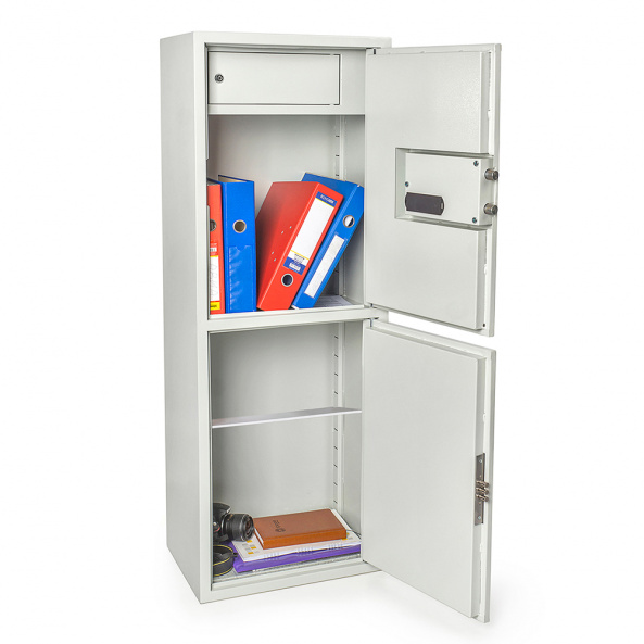 Сейф-шкаф офисный БЛ-127К1Е1.Т1.П2.7035 с ключевым и электронным замком, с двумя полками и трейзером.