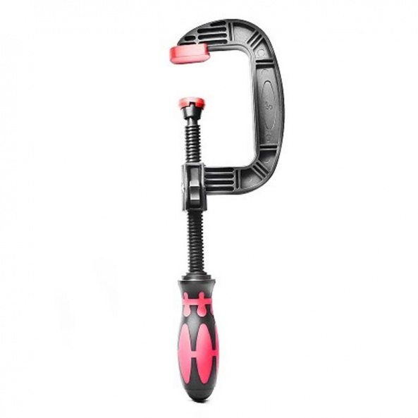 G-образная форма позволяет зажимать детали до 75 мм. Прорезиненные губки бережно относятся к поверхности, не царапая и не продавливая ее в процессе зажима.