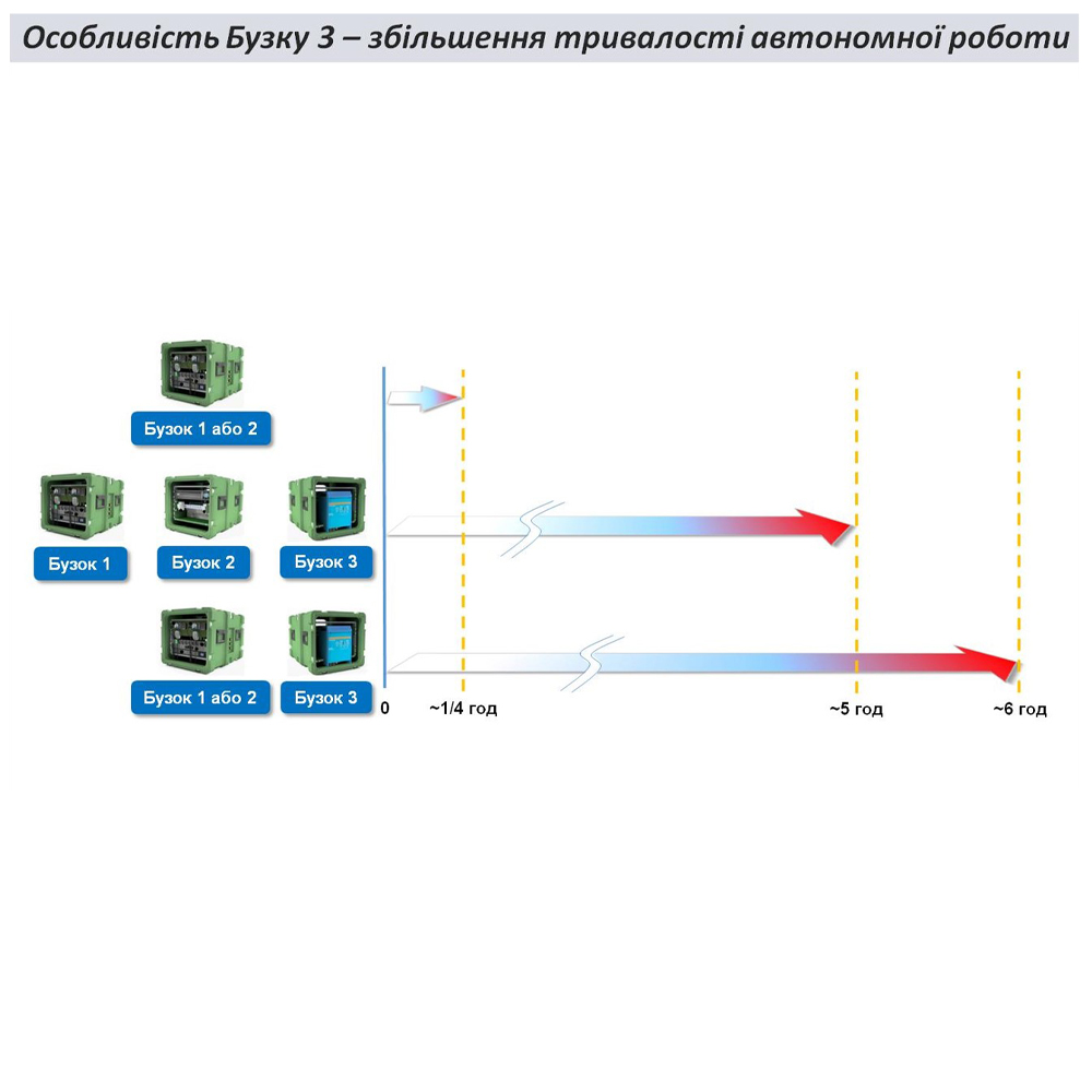 Телекоммуникационный энергетический комплекс Бузок 3 для энергетического обеспечения Бузок 1 (бокса радиосвязи) и Бузок 2 (бокса открытой связи) как отдельно, так и вместе в течение длительного времени автономной работы для "Мобильных пунктов управления". Он предназначен для гарантированного и стабильного обеспечения питанием средств радио, телефонной открытой, интернет-связи, передачи и отображения данных для ответственных лиц (пользователей) передвижных пунктов управления в различных сферах человеческой деятельности (энергетики, строительства, транспорта, телекоммуникационных служб, муниципальных учреждений, охранных организаций, органов правопорядка и т.д.). Интерфейсы: Schuko x 4 шт, специальные для питания 6 шт. Система электропитания: 12-24 В постоянного тока. Функция ИБП: технология преобразования линейно-интерактивная (Line-Interactive), P= 3000 ВА / 2400 Вт, с функцией UPS (20 мс), U=187-265 В, ток bypass до 50 А, ток заряда АКБ до 70 А, АКБ 12 В, 134 A·ч, входное напряжение: 220 В, частота 50 Гц, нагрузочная мощность: не более 1800 Вт. Уровень шума: 38 дБ. Технические условия: ТУ У 26.3 -13881657-005:2023; ААНЗ.461262.075 ТУ. Безопасность: ГОСТ В 20.39.308. Конструкция: контейнер 19", 8U. Пылевлагозащита: IP65. Страна производитель: Украина