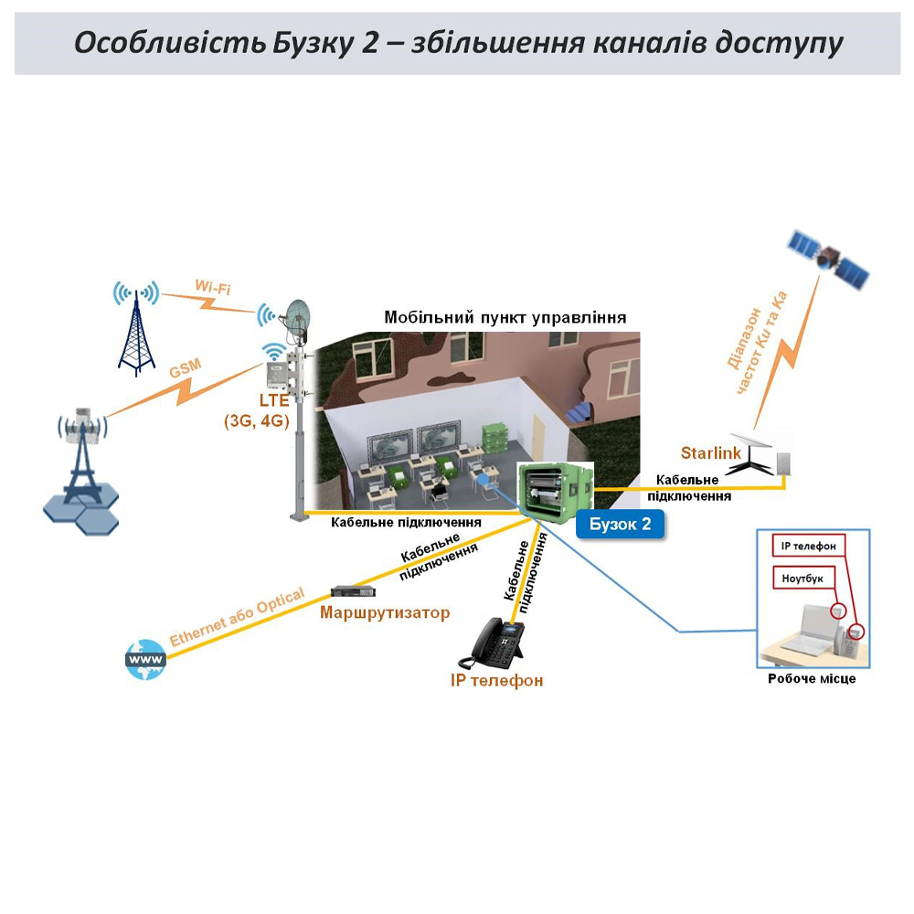 Телекоммуникационный комплекс открытой телефонной и интернет-связи для "Мобильных пунктов управления" Бузок 2 предназначен для обеспечения связью, передачей и отображением данных ответственных лиц (пользователей) передвижных пунктов управления в различных сферах человеческой деятельности (энергетики, строительства, транспорта, телекоммуникационных служб, муниципальных учреждений, охранных организаций, органов правопорядка и т.д.). Интерфейсы: 48 x 1000Base-T (до 24 с возможностью расширения до 48), 4 x 1000Base-X (до 2 с возможностью расширения до 4), тел. порты FXS (RJ-11) x 4, 4 SIP-аккаунта, 2 SIP-профиля для работы с 2 SIP-серверами, Schuko x 2 шт, функциональные 9 шт, специальные для питания 1 шт. Система электропитания: 12-24 В постоянного тока. Функция ИБП: технология преобразования линейно-интерактивная (Line-Interactive). Входное напряжение: 220 В, частота 50 Гц. Потребляемая мощность: не более 500 Вт. Уровень шума: 38 дБ. Технические условия: ТУ У 26.3 -13881657-005:2023; ААНЗ.461262.075 ТУ. Безопасность: ГОСТ В 20.39.308. Конструкция: контейнер 19", 8U. Пылевлагозащита: IP65. Страна производитель: Украина