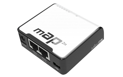 Mikrotik mAP-2n - мініатюрний бездротовий маршрутизатор в пластмасовому корпусі для домашнього або офісного використання з двома мережевими портами. Вбудований бездротовий модуль працює на частоті 2.4 ГГц, підтримує стандарти 802.11 b/g/n, інтегрована антена 1.3 дбі. Відмітною особливістю є можливість живлення на стандартів 802.3 af і 802.3 at, а так само пасивним PoE 8-57 вольт через перший мережевий порт, і передачу живлення PoE через другий. USB 2.0 порт використовується для підключення 3G модему.