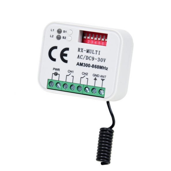 Универсальный приемник RX-MULTI способен записывать пульты на широком диапазоне частот от 433 МГц и до 868 МГц. Для всех типов ворот и шлагбаумов. Рабочая частота: 433.92 / 868 МГц. Тип кода: Динамический / Постоянный. Кодирование: Динамическое / Постоянное. Количество каналов: 2. Вид: Внешний. Программирование: Универсальное. Совместим с пультами: Berner, Clemsa, FAAC, Gant, Hormann, Liftmaster, Marantec, Nice Flor, Prastel, Sommer. Память, устройств: 400. Питание: 9 - 30 В