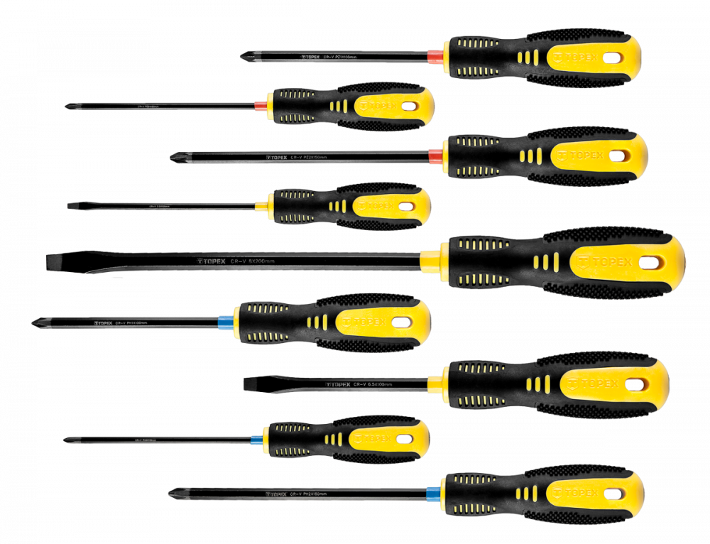 Набір викруток TOPEX призначений для виконання механічних робіт, а також робіт, які виконуються майстрами-аматорами. Стрижень кожної з дев'яти викруток виготовлений з міцної хромомолібденової сталі, що забезпечує довгий термін служби інструменту. Магнітне жало із загартованої сталі полегшує роботу з інструментом. Ергономічна пластикова рукоятка, покрита антиковзаючим матеріалом, забезпечує комфорт і безпеку під час роботи. Бренд TOPEX призначений для домашніх майстрів.