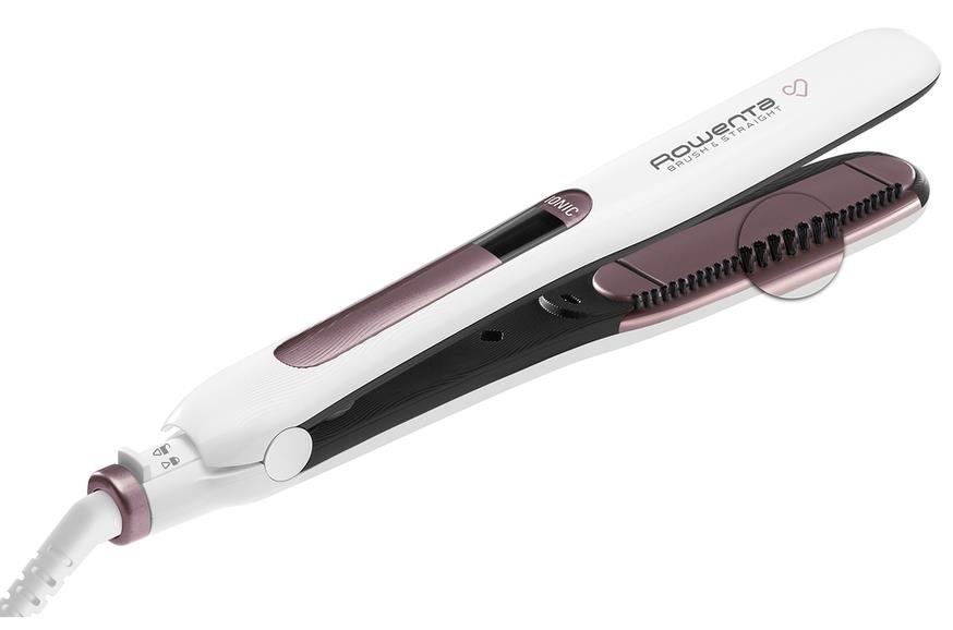 Вирівнювач для волосся Rowenta Premium Care Brush&Straight дозволяє ідеально вирівняти волосся при температурі 170 °С без пошкодження. Вбудована щітка з натуральною щетиною допомагає зберегти природний об'єм, а ексклюзивне покриття пластин Cashmere Keratin та генератор іонів забезпечують сяючий блиск вашому волоссю. LCD-дисплей дозволяє контролювати температуру з високою точністю від 130 до 200 °С.