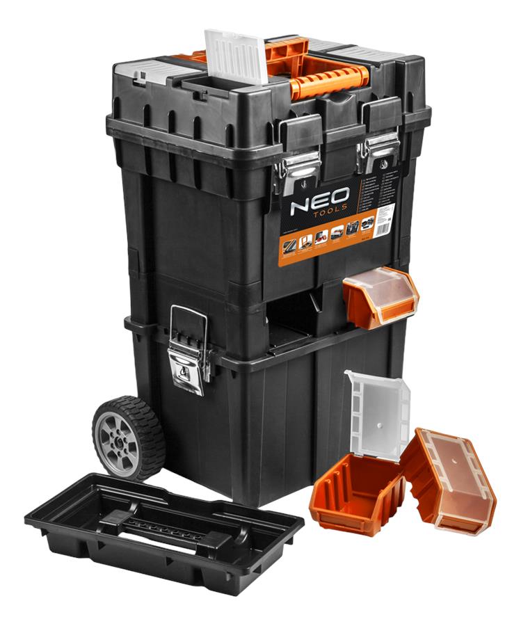 Майстерня мобільна NEO (арт. 84-115) розмірами 40x40х70,5 см. Містка та мобільна інструментальна майстерня, виготовлена з міцного пластика з металевими замками. Майстерня обладнана коліщатками для полегшення переміщення. Майстерня складається з трьох функційних частин і є повністю розкладаною. Верхня частина складається з інструментальної скрині, середній модуль складається з чотирьох ергобоксів, натомість нижній ― з місткої скрині для габаритного інструменту. Майстерня має також 4 органайзера для зберігання дрібних елементів, вбудовану тацю та дві зручні ручки для переношування або котіння. Марка NEO відповідає очікуванням професіоналів.
