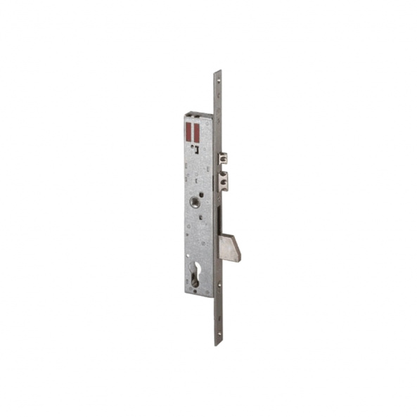 Электромеханический замок, врезной, установка внутренняя, однооборотный механизм, выкидной ригель, цилиндр, расстояние между осью цилидра и торцом двери: 25мм; 12В/2А. Без питания закрытый