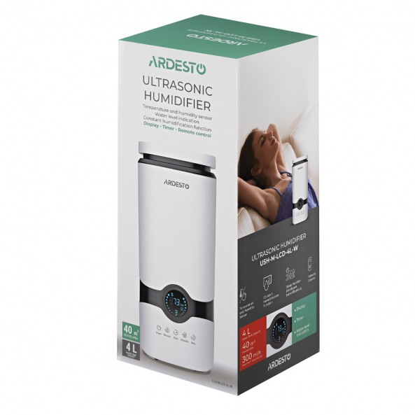 Увлажнитель воздуха Ardesto USH-M-LCD-4L-W, 4 л, до 40 м2, ультразвуковой, верхний залив, дисплей, таймер, пульт ДУ